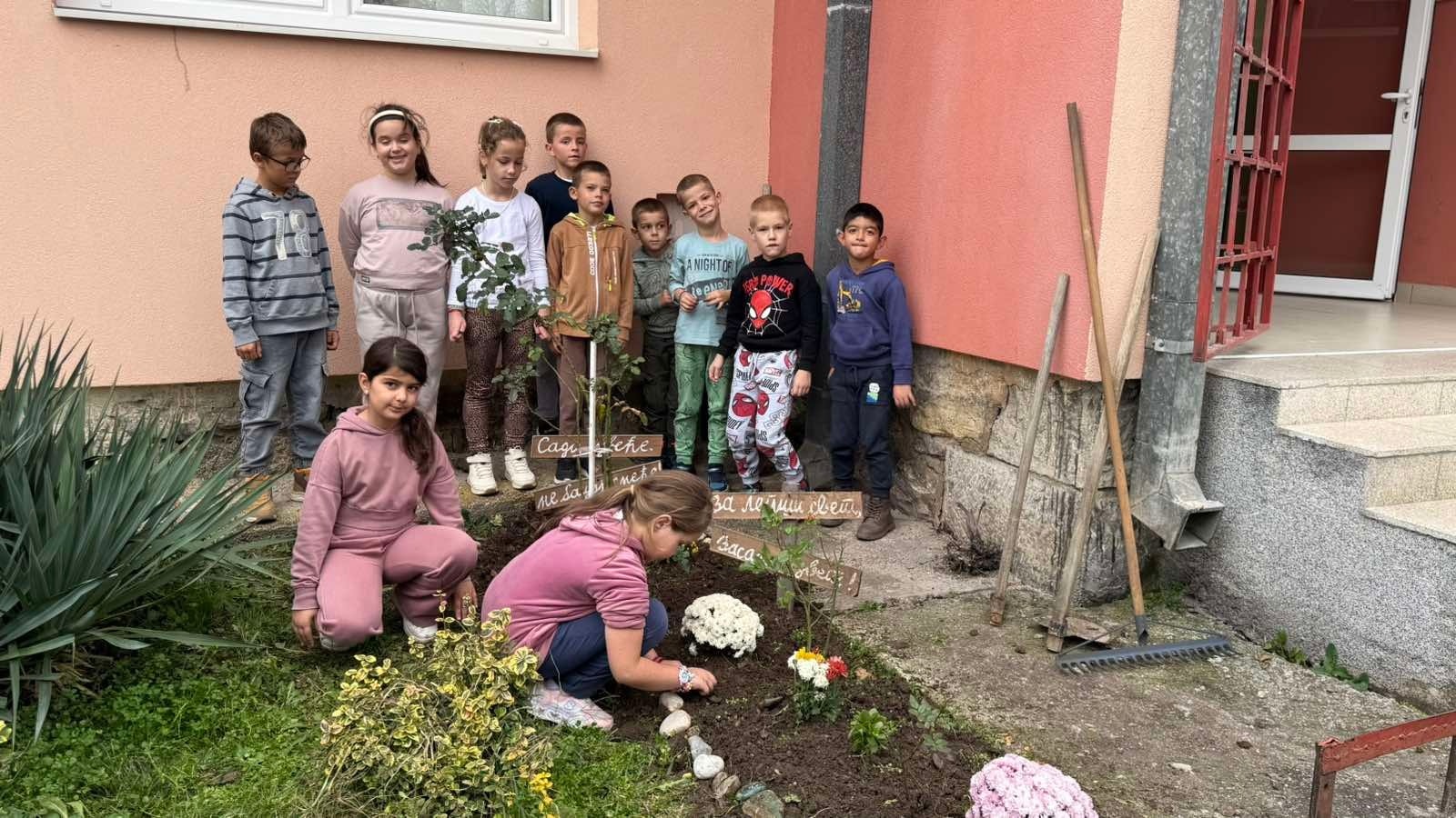 Ученици првог и другог разреда су са својим учитељицама Слађом и Весном, а испред Тима за заштиту животне средине и уређење школског простора, као