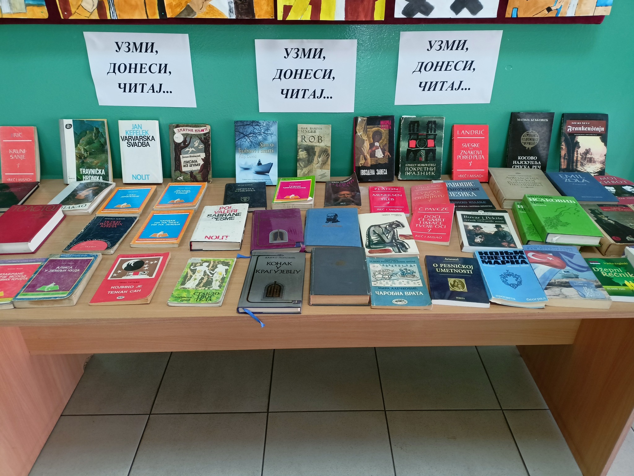 Након богаћења фонда наше школске библиотеке и отварања Читалачког кутка за одрасле направљена је још једна занимљива и корисна акција: Узми – Донеси – Читај. Ученици, наставници и мештани моћи ће да узму било коју изложену књигу, а да донесу неку своју коју су прочитали. Књиге су изложене у холу школе и лако су доступне свима који су заинтересовани. Важно је читати!