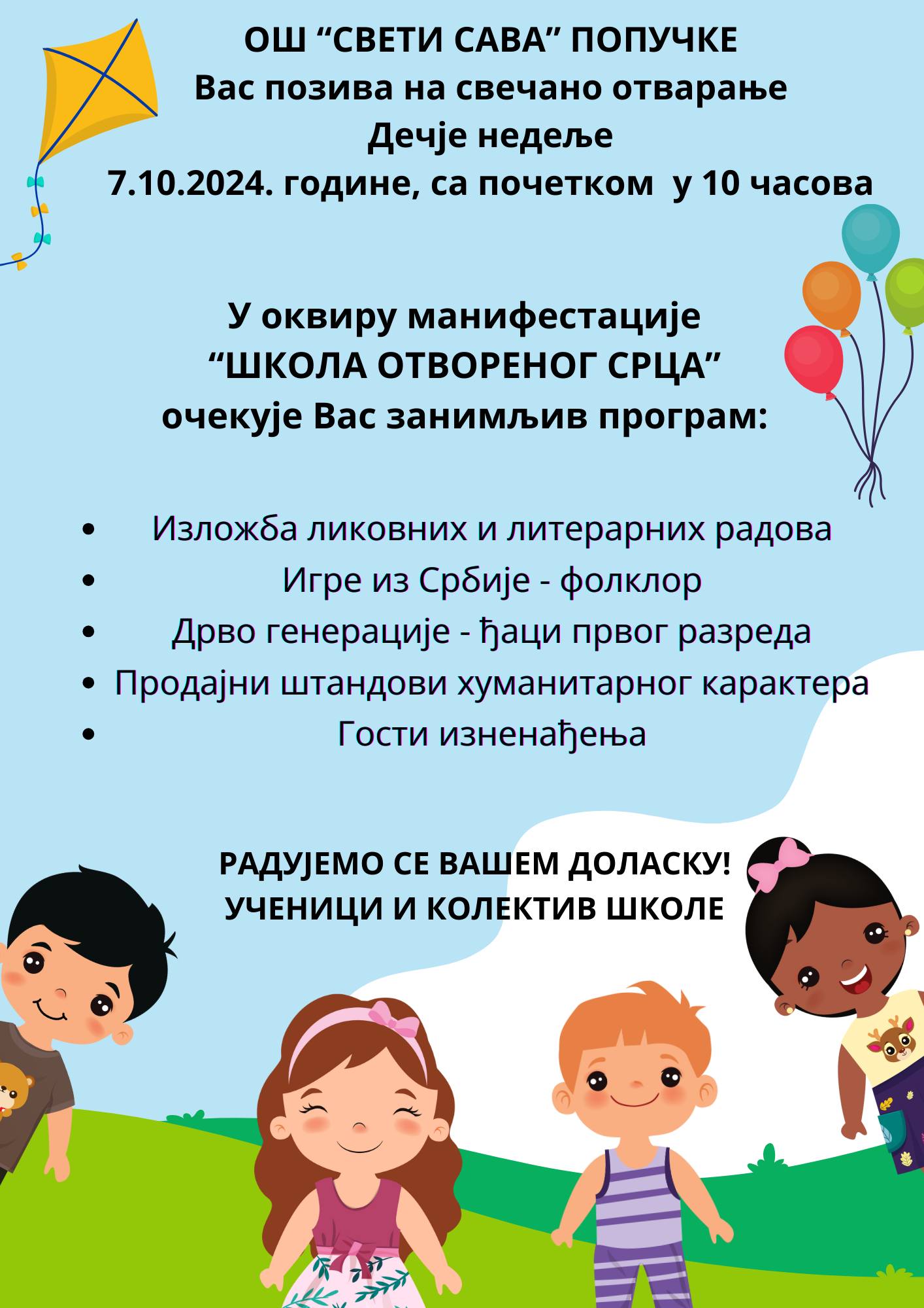 info 4. oktobar 2024.19. oktobar 2024. Дешавања ЈА САМ ДЕТЕ ИМАМ ПЛАН: ТОЛЕРАНЦИЈА И ЉУБАВ ЗА СВАКИ ДАН! Домаћин: ОШ „Свети Сава“ – Попучке