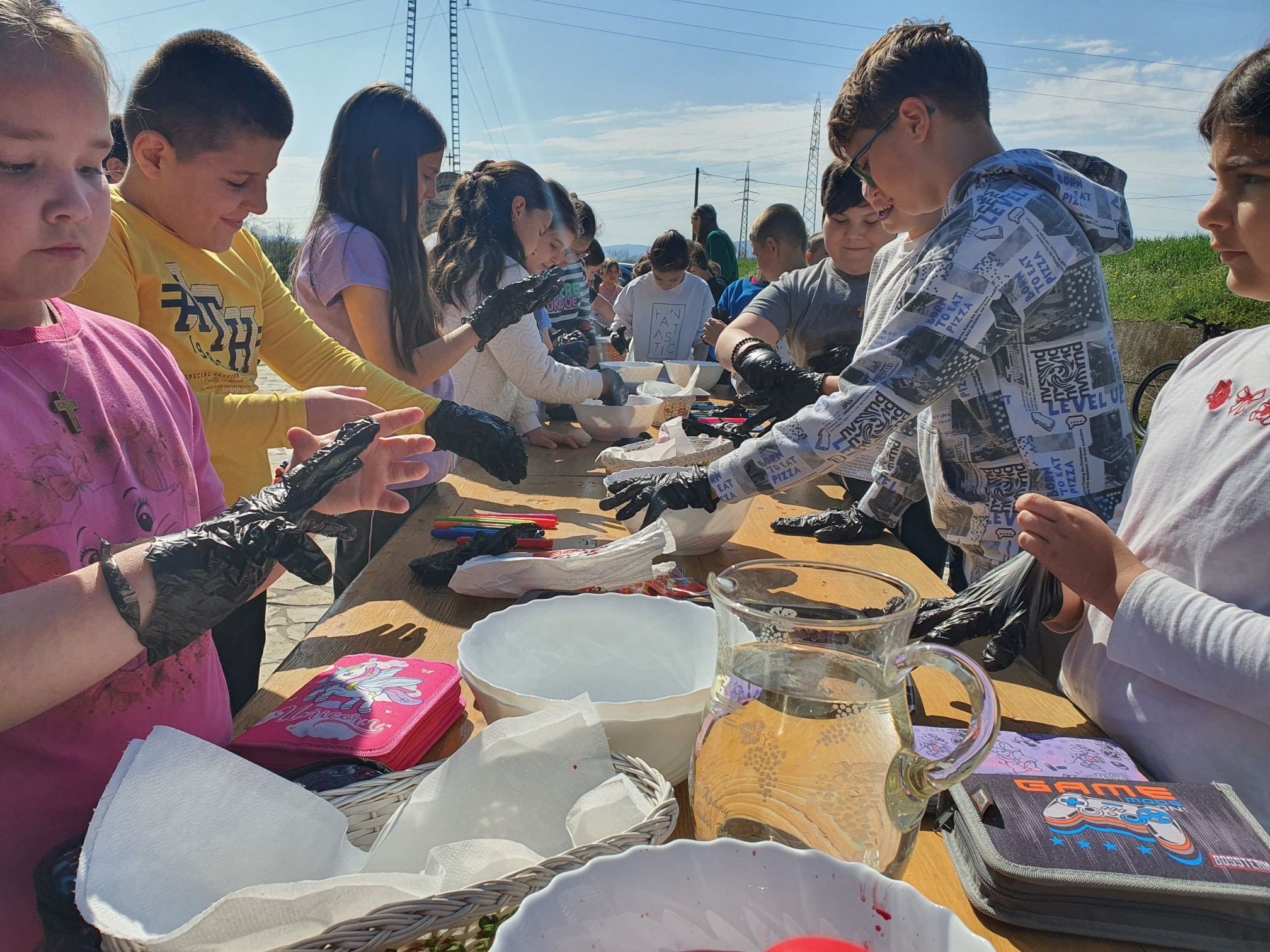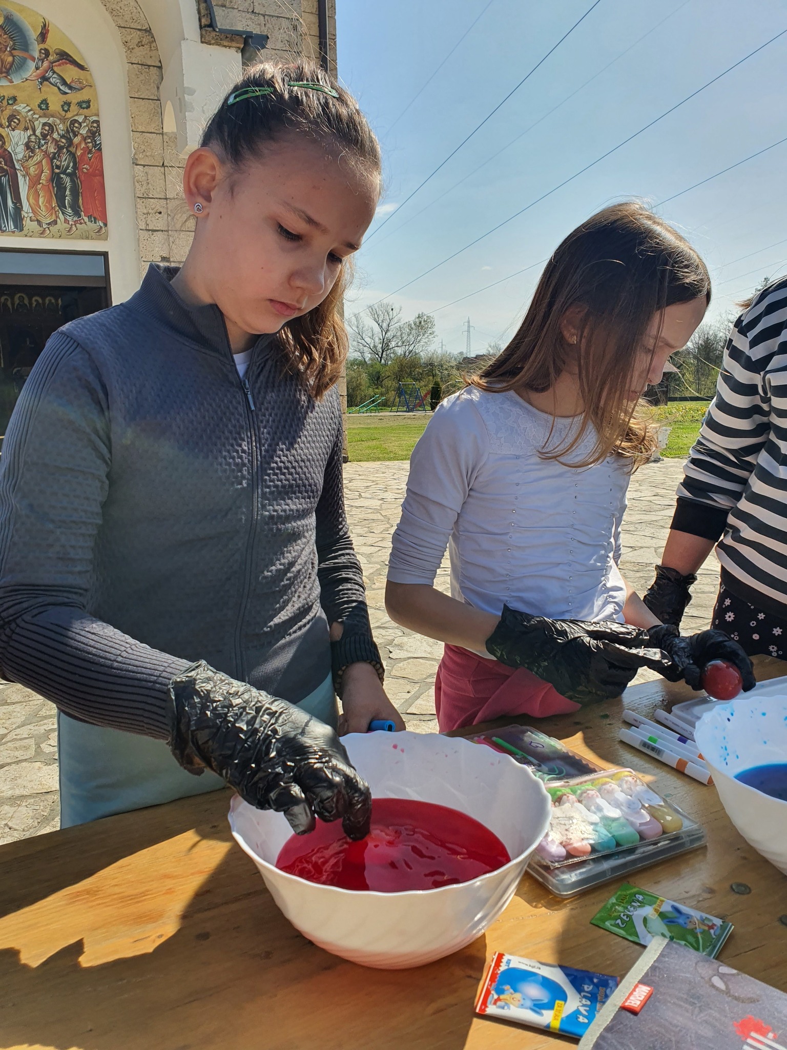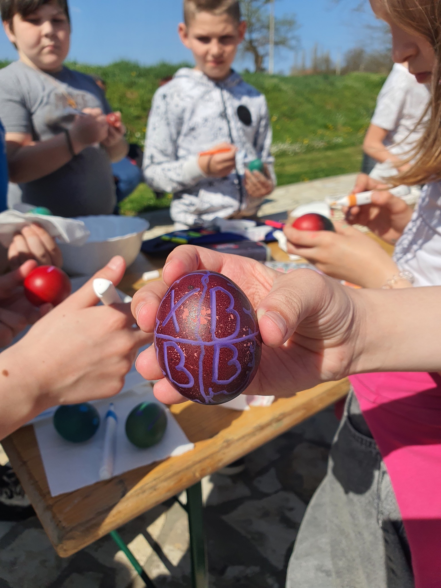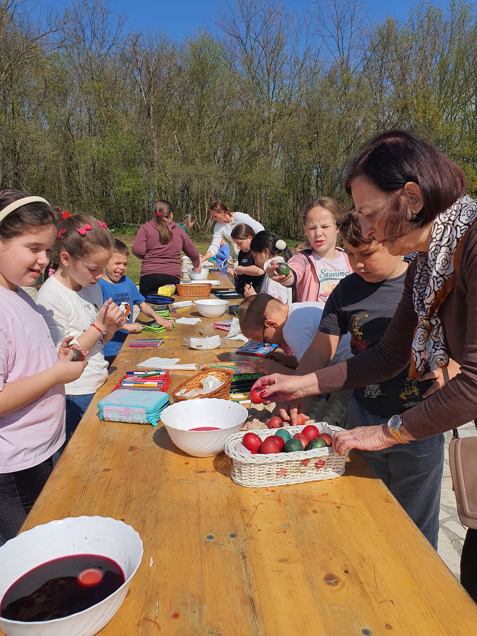 Након тога уследио је креативни део радионице у порти цркве. Ученици су учествовали у фарбању и шарању јаја за васкршње празнике, показујући маштовитост и радост у раду. Радови су били разноврсни и креативни, а ученици су уживали у заједничком стварању.
